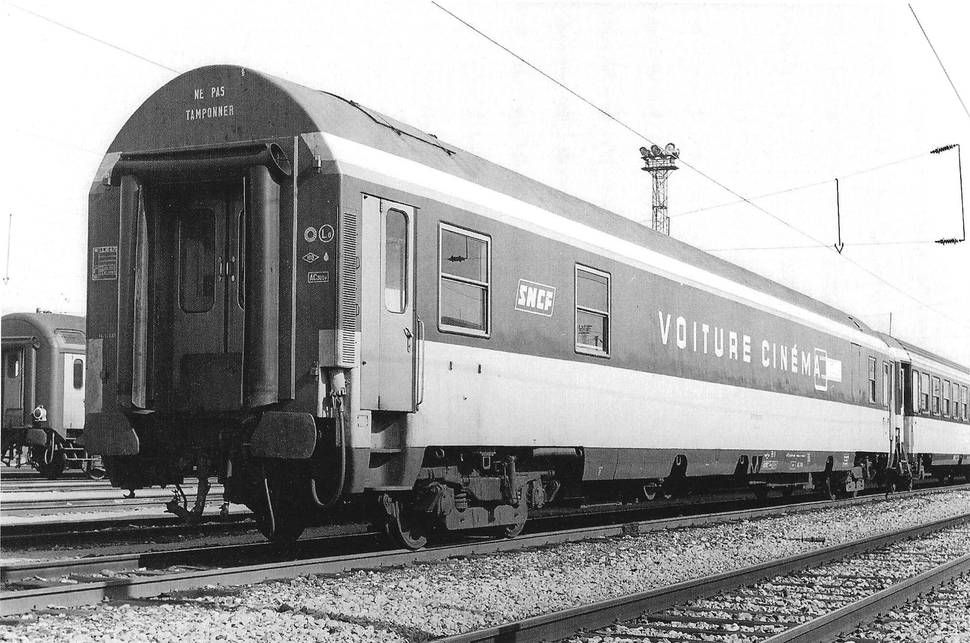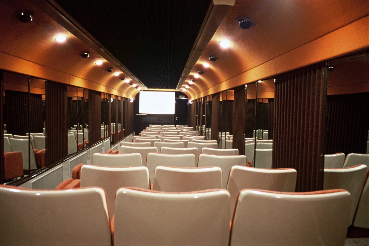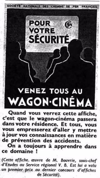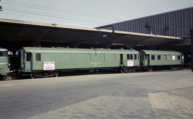 C’est ainsi qu’une seule des 8 voitures, dont la S.N.C.F. disposait jusqu’à présent, était à même d’assurer un tel service. La Section Centrale Cinématographique l’avait aménagée en 1946 à partir d’une voiture-salon A2c2 L3 construite en 1926 par le réseau P.L.M. Ses possibilités de projection en marche lui permirent de participer depuis 1953 à un certain nombre de trains spéciaux, voyages officiels, voyages de presse, inaugurations d’installations S.N.C.F. ou privées, etc… Toutefois elle était surtout destinée à présenter des films ferroviaires et industriels dans les foires commerciales et les expositions en France et à l’étranger (Foire Internationale de Milan en avril 1960) et à renforcer, suivant les besoins, les tournées de prévention des accidents organisées par les Sections Cinéma régionales.