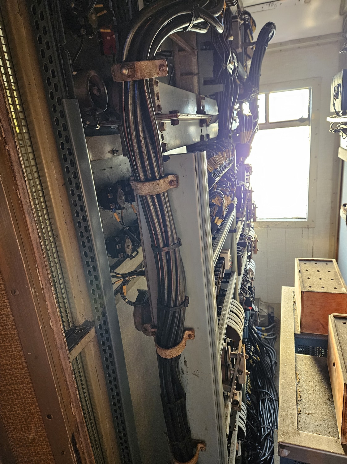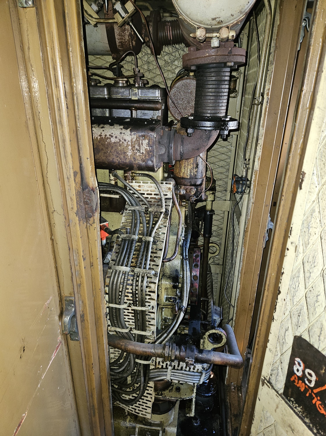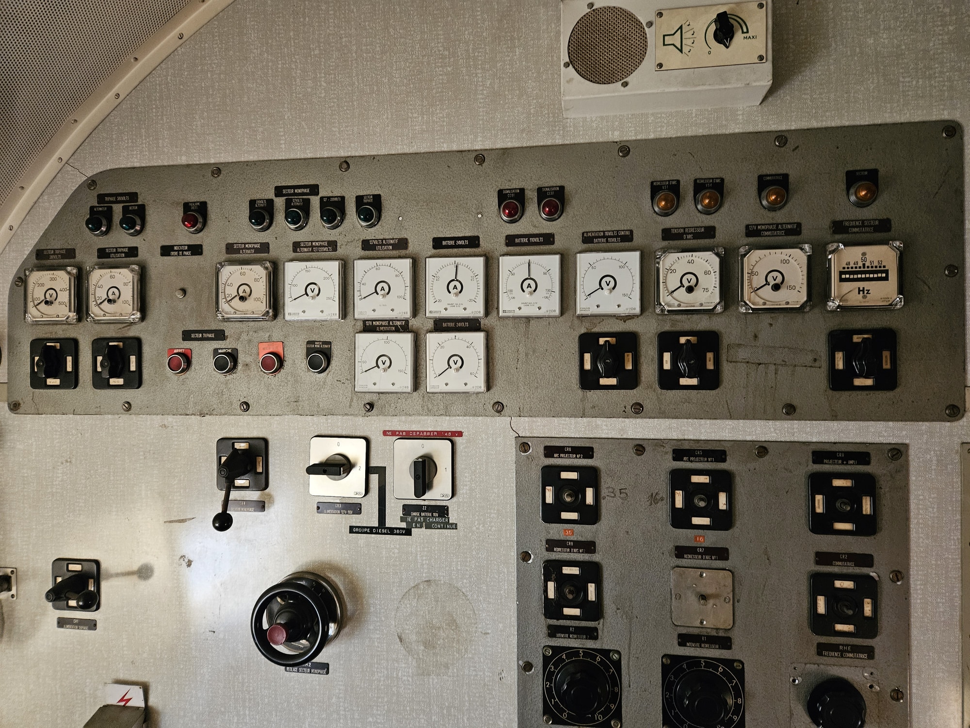 D’un côté de la salle, de 17,50 m environ de longueur, se trouve la cabine de projection avec ses annexes et de l’autre côté, un local fortement insonorisé abritant un groupe électrogène « Diesel-alternateur ». Ce dernier fournit le courant nécessaire à toutes les installations (conditionnement d’air, éclairage, cabine de projection, etc.), en sorte que la voiture conserve son autonomie de fonctionnement en toutes circonstances et quel que soit le mode de traction, électrique, diesel ou vapeur.