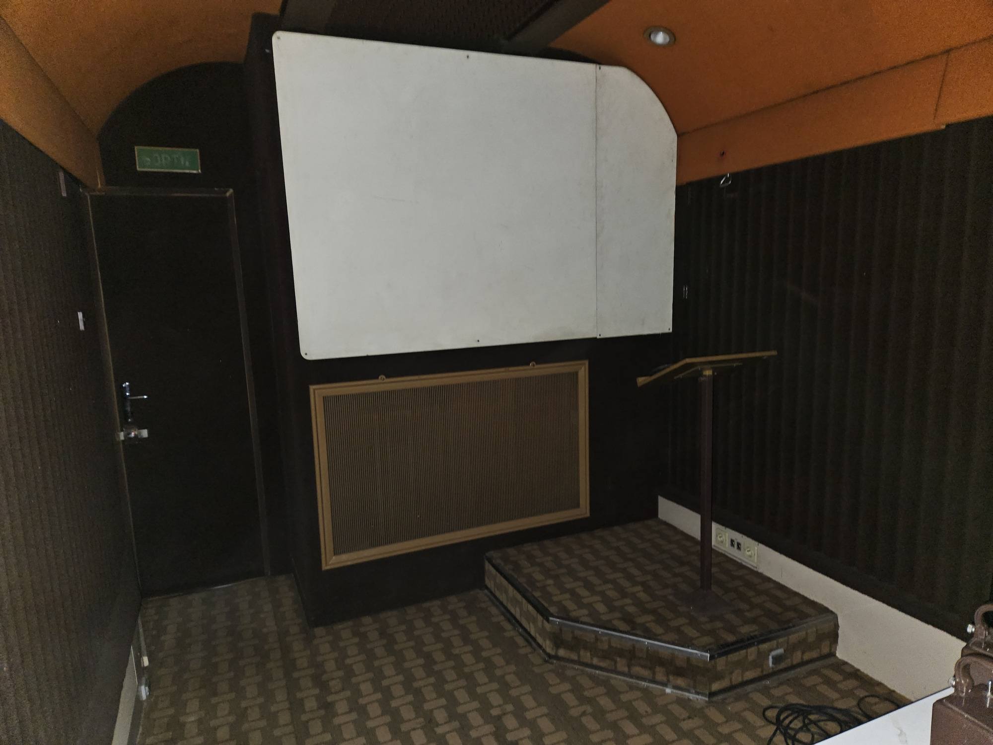 Les parois latérales et le plafond, aux lignes sobres et nettes, sont revêtus d’un texoïd vert foncé collé sur molleton, ne donnant aucun reflet gênant lors des projections. Le sol est recouvert d’une moquette gris anthracite qui contribue à amortir les bruits intérieurs.